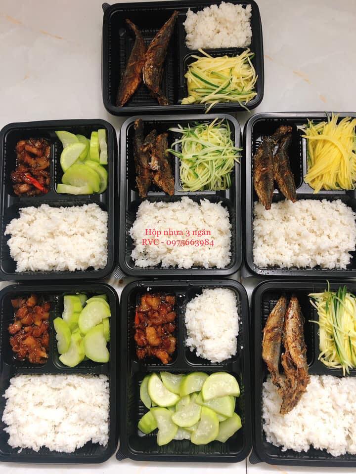 Công dụng: hộp nhựa đựng cơm 3 ngăn được thiết kế chuyên dùng phục vụ mảng thực phẩm giao đi.